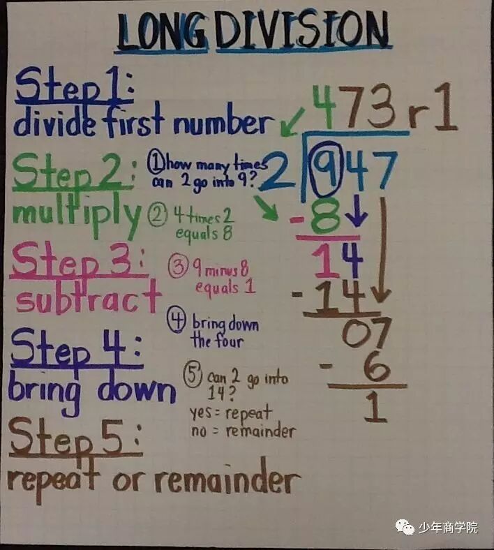 还有一不小心就会算错的竖式除法计算,只要列清楚要点,就不容易出错了: