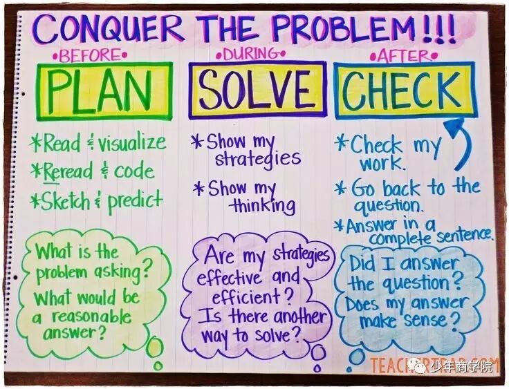 看到题目时,先圈出关键数值、划出问题、框住数学动词。开始演算后,要问自己:这道题要用哪几个步骤?最后,为了确保答案绝对正确,别忘了认真检验一遍。