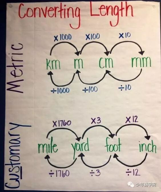同样地,在学习长度时,会涉及到两种单位制度,由于换算的数值和方法都不一样,是非常容易混淆的。这时就可以用画出“公制”和“习惯制”的转换过程: