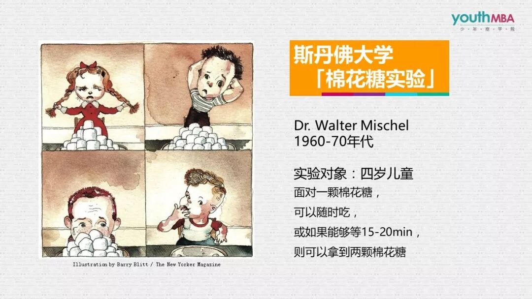 接下来我要分享教育界非常经典的一个实验–棉花糖实验。1966年到1970年代早期,斯坦福大学WalterMischel博士在幼儿园进行了有关自制力的一系列心理学实验,研究对象是4岁左右的儿童,他们找了几百位儿童进行实验。