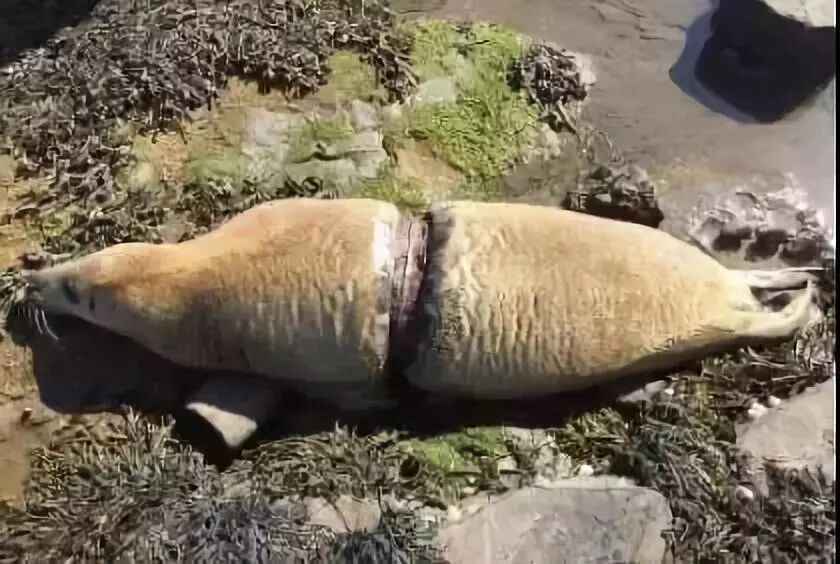 然而海豹越长越大,塑料环却纹丝不动,始终没有脱落的迹象,直至最后深深地卡进了海豹的肉里。救援人员无能为力,只能眼睁睁看着它死去。