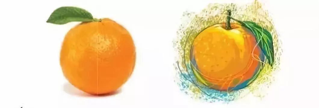 来看下面的这个柳橙作品,左边是真实的柳橙照片,右边是运用绘画技巧创造出的柳橙质地:给人表面粗糙、不光滑的质感。