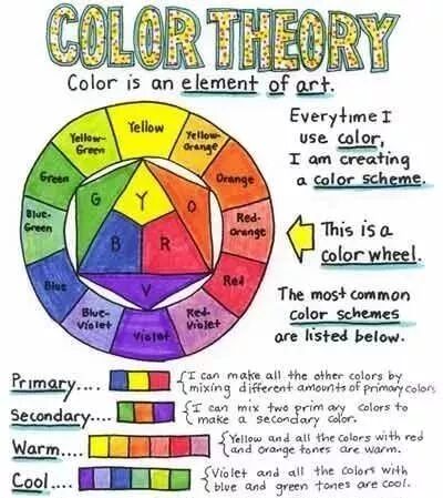 2)第二级颜色(secondary colors): 当两种基本色混合在一起时,会形成第二级颜色,比如红色+黄色=橙色;蓝色+黄色=绿色;蓝色+红色=紫色。