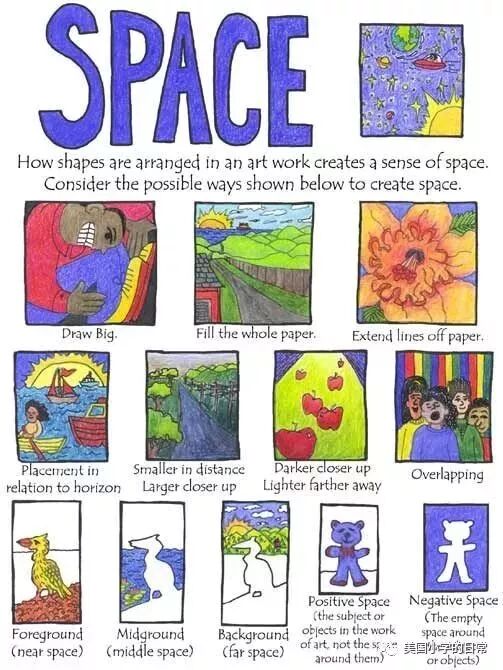 从上面的艺术大纲中看到,四项中的两项并不是让孩子真的去创作一幅画或一个艺术作品,而是让孩子通过欣赏艺术,来感受艺术,并建立自己与作品之间的联系。那么,美国学校的艺术启蒙是如何开始的呢?孩子们首先要了解的就是艺术的7大元素(7 elements of art)。