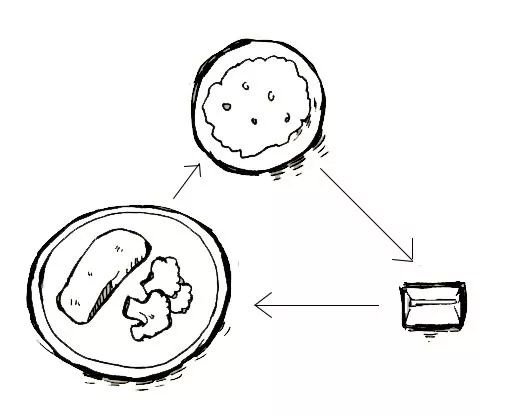那么这三个食物可以连成一个三角形,吃饭顺序也要以此类推:米饭→肉/菜→牛奶→米饭→肉/菜→牛奶…..(一次吃一口)