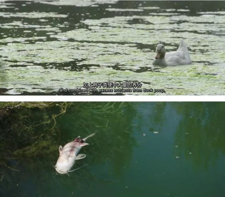 更严重的是,生活在池塘的鸭子所产生的大量粪便,导致了水藻大规模繁殖,鱼类无法生存。