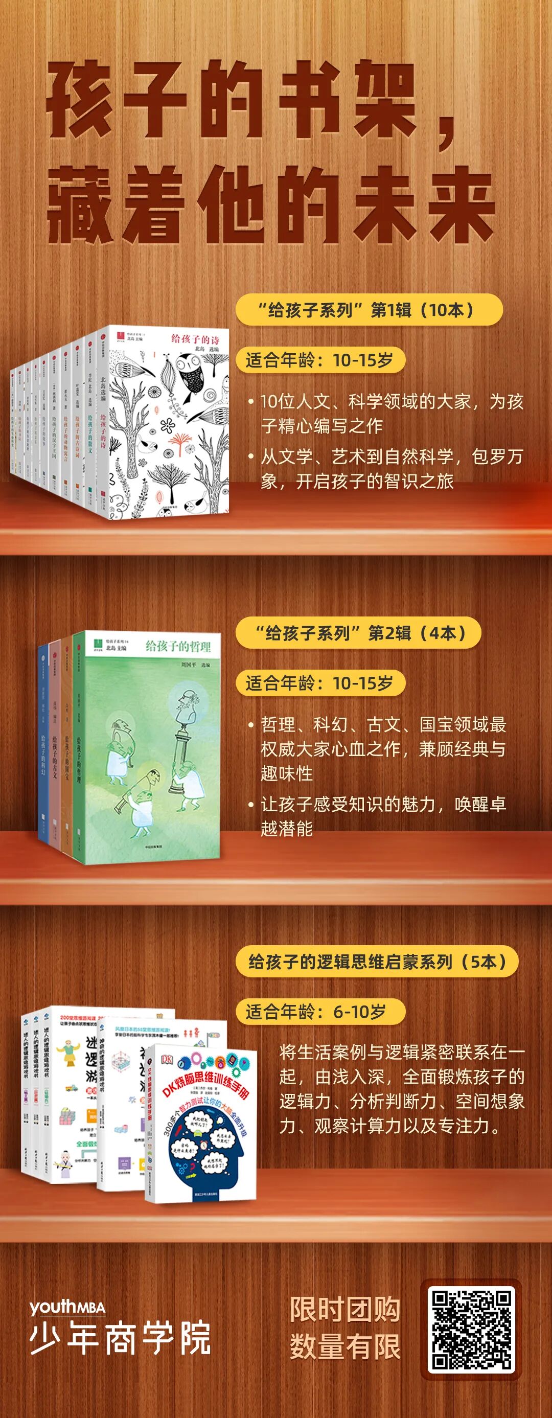 少年商学院最新推出春季团购书单,分别是《给孩子系列第1辑》(共10本)、《给孩子系列第2辑》(共4本)、《给孩子的逻辑启蒙系列》(共5本),本次我们跟出版社定制的数量有限,先到先得,长按下方图片识别,或点击“阅读原文”,即可购买。