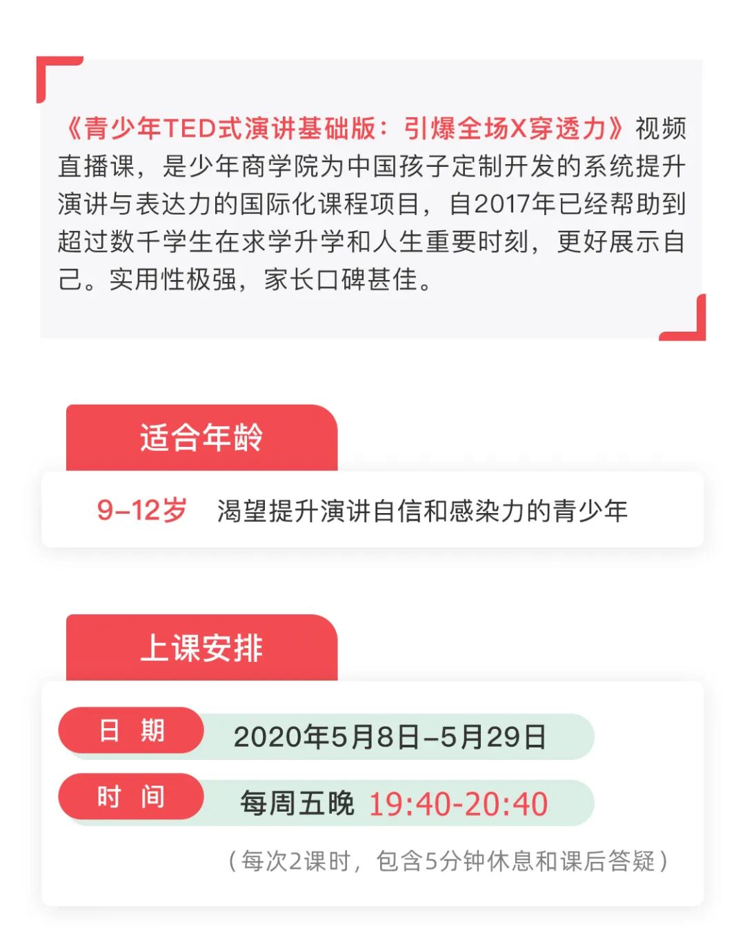 前一段时间,深圳学霸刘洁的两段英文演讲刷爆全网。为了用自己的方式给所有经历疫情的同胞传递信心,刘洁先后发表了《We Are All Fighters(我们都是战士)》和《Thank You, World(谢谢你,世界)》演讲视频,收获数十万中外网友点赞。与许多成为“爆款”的短视频不同,这两个演讲最打动人心的是演讲者质朴的语言、真挚的情感。事实上,除了公开表达观点,演讲早已是课业展示、升学考核中至关重要的环节。只需短短几分钟,招生官就可以看出孩子的语言表达能力和逻辑思维能力。那么,该如何提升孩子自信,让孩子成为有感染力的演讲者呢?在少年商学院2020春季学期视频直播课中,我们特别推出了《青少年TED式演讲系列(基础版)》课程,这一系列在5月份的单门项目制课程是:引爆全场 X 感染力,适合9-12岁想要提升演讲自信和感染力的孩子。这门课从“演讲如何开头结尾”到“如何与听众建立信任感”,手把手带孩子掌握演讲技巧与方法。通过丰富有趣的故事案例,让孩子更有条理地表达、更有质量地思考、更高效地沟通。拉至文末,点击“阅读原文”即可报名!
