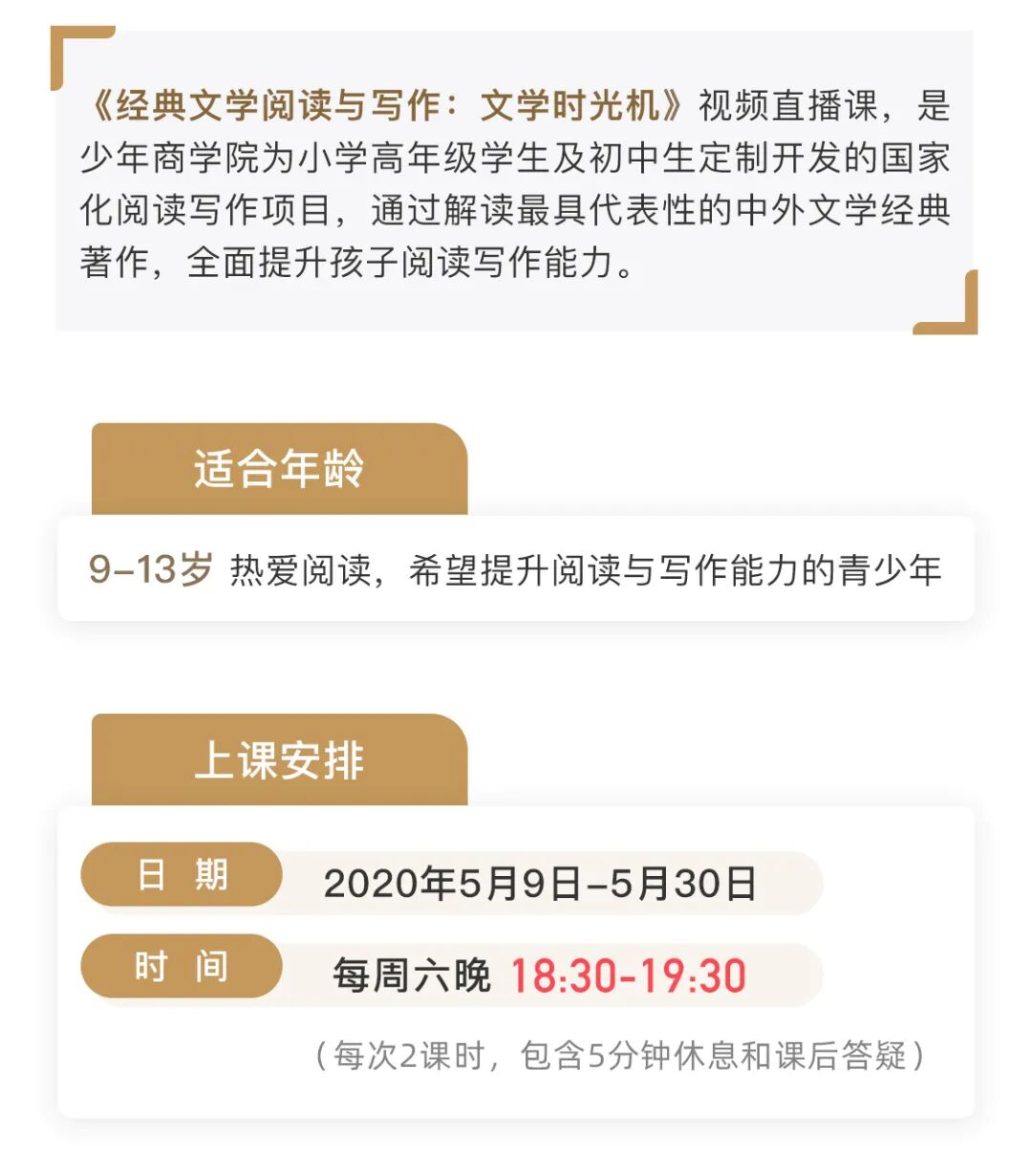 在少年商学院2020春季学期视频直播课中,我们特别推出了《经典文学阅读与写作》课程,这一系列在5月份的单门项目制课程是:文学时光机,适合9-13岁想要提升阅读与写作能力的孩子。