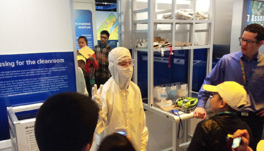 参与实验之余,也有同学临时充当了现场工作人员的小帮手。在Intel博物馆,团队里的夏同学幸运地被现场的工作人员选中,可以试穿防尘服!原来,电脑芯片的消毒标准必须比医院的高出一万倍,流水线上的工作人员每次开工前都得全副武装。