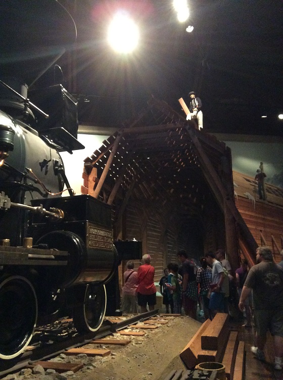 当时我们站在一个偌大的室内展厅里,这里被改造成当年美国西部大开发时的一个矿景,上面散落着不少华人劳工住的工棚,一辆运煤的火车正“呼啸而来”。