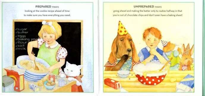 2.有条理(Organized):作者用自己做饼干的经验告诉孩子们,如果我们平时就养成把东西归类的原则,那么制作饼干的过程就会简化很多,相反的,如果我们没有条理,把东西随手乱放,那么,等到做饼干的时候,我们就什么都找不着了。
