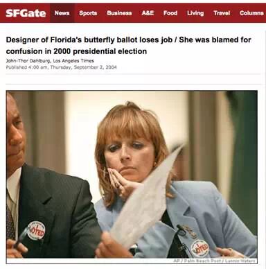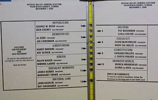 这里补充一个背景知识,美国人投票得在选票上的小孔做标记,一个候选人对应一张孔。美国一个女设计师为了节省纸张,设计了一张神奇的选票,叫“蝴蝶选票”。