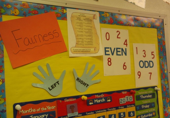 月份牌上方的墙上写有学校的规则,左边写有大大的Fairness(公平公正),右边是奇数与偶数,下方有左右手的手印,表明:奇数与偶数、左手与右手都是一样的重要,突出Fairness的主题(如下图)。
