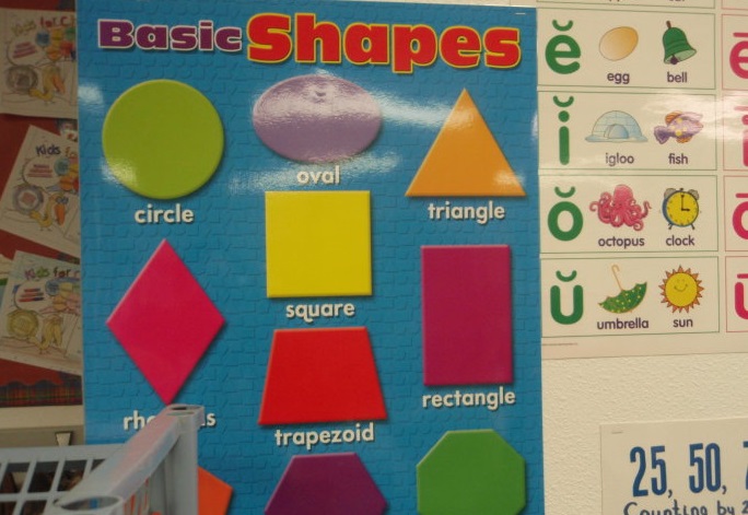 再往里的墙上,挂着物体基本形状的几何图形,下方是以奇数偶数分列的1-100的数字板块,旁边是关于英语原音a,e,i,o,u的发音的(如下图)。