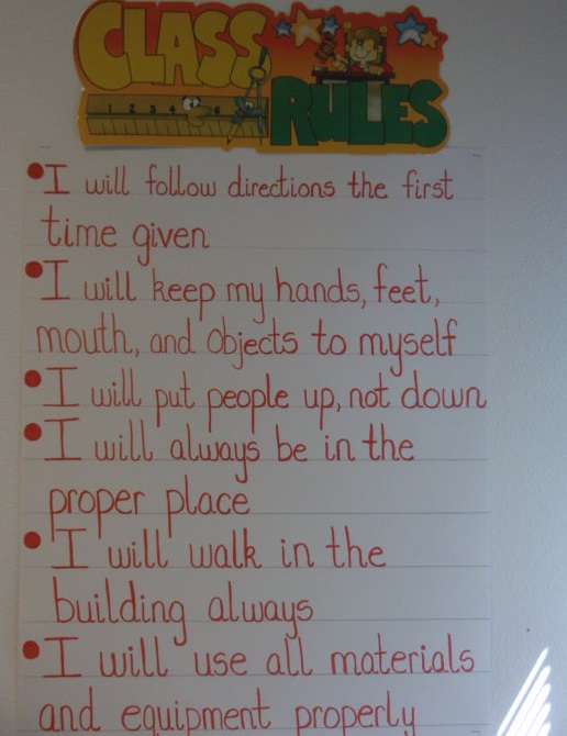 以上的班规很具体,也很有美国的特点。其中“我一定鼓励别人,而不贬低他们。”(I will put people up, not down),有准确评价别人、鼓励别人的意思。第四条,实际是保证自己总在合适的地方,或不去不应该去的地方,与第五条有相似之处,美国的校规,小孩子不可以轻易走出教学楼,完全是从安全考虑的。