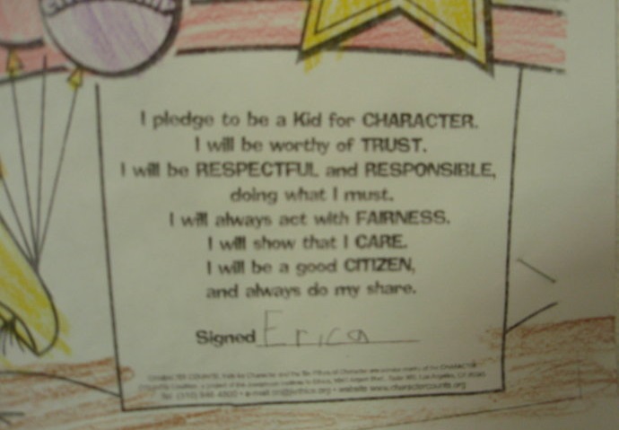 这份签字书上列出了这样几种基本品质:信任、尊重别人、责任、公平公正、关心、好公民、应做的一份,等七种。这当中有一条给我印象尤其深刻:做一个好公民!